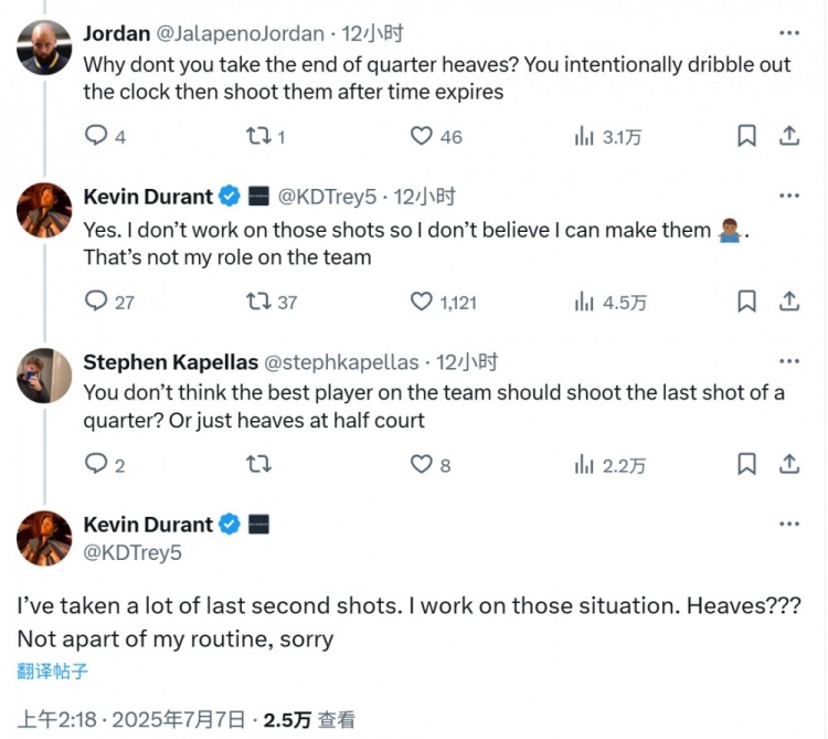 杜兰特:“我投过很多压哨球。我会针对那种情况进行训练。全场超远投???这可不是我日常训练的一部分,抱歉。”