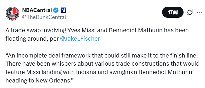 北京时间1月23日,据名记Fischer报道,印第安纳步行者队与新奥尔良鹈鹕队已就多套交易方案展开探讨,核心框架为将步行者队效力第四个赛季的后卫本内迪克特-马瑟林送至新奥尔良,同时换来鹈鹕队二年级中锋伊夫斯-米西。