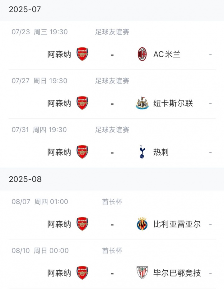 然而即使错过阿森纳7月19日出发的航班,约克雷斯也可以赶上后续的季前赛。按照赛程,阿森纳将于7月23日、27日以及31日分别对阵AC米兰、纽卡和热刺。